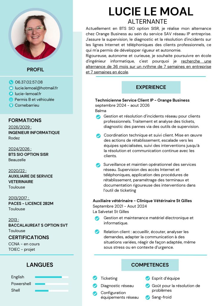 Actuellement étudiante au CFAI UIMM de Beauzelle, je réalise un BTS SIO option SISR en alternance. Cette alternance se fait en partenariat avec Orange Business où je travaille en tant que Technicienne Service Client au Service Après Vente réseau IP sur le Campus Tolosa, à Balma.